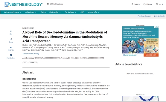 近日,我院夏建勋教授以共同通讯作者身份在全球麻醉学领域顶级期刊ANESTHESIOLOGY(《麻醉学》)上在线发表了一篇题为A Novel Role of Dexmedetomidine in the Modulation of Morphine Reward Memory via Gamma-Aminobutyric Acid Transporter-1的研究论文。