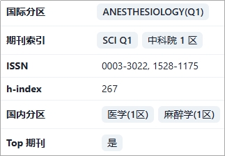ANESTHESIOLOGY(《麻醉学》)是美国麻醉医师协会 (ASA) 的官方期刊,最新发布的影响因子为9.1(2025)。由Lippincott Williams & Wilkins(Wolters Kluwer 旗下)出版,创刊于1940年,ISSN:0003-3022,eISSN:1528-1175,月刊发行。作为麻醉学领域全球排名前3的顶级期刊,专注于发表围手术期医学、重症监护与疼痛医学的高质量基础、临床和转化研究,强调科学严谨性、临床相关性与创新性,对全球麻醉学诊疗指南制定与研究方向具有决定性引领作用,是麻醉学领域最具影响力的核心期刊之一。根据2025年中科院最新分区,大类学科为医学1区,小类学科麻醉学1区,且为TOP期刊,学术影响力位居全球同领域前列。